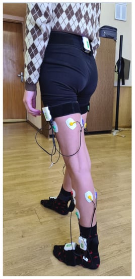 A biomechanical gait analysis was performed using the Stadis system (Neurosoft, Ivanovo, Russia). Neurosens inertial sensors were attached to the subject’s sacrum, the outer middle-third of the thigh, the outer ankle, and the foot instep, on both sides (Figure 1). A total of seven sensors were used. Each sensor also had two channels for EMG data. The thigh-located sensors captured the EMG signals of the rectus femoris and joint activity of the hamstring muscles. The lower-leg-located sensors captured the EMG signals of the anterior tibial muscle, as well as the joint activity of the external and internal heads of the triceps surae. Disposable Medico electrodes were used for EMG recording. We analyzed the maximum amplitude of each muscle (μV) based on smoothed rectified EMG normalized to the gait cycle and did the same with the goniograms.