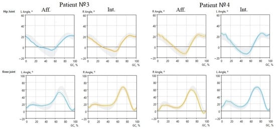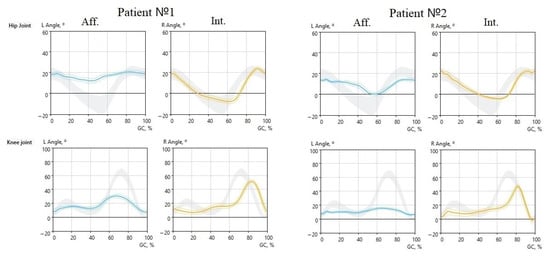 Subject 1 walked with the help of crutches. Therefore, the hip joint amplitude in the affected limb was insignificant, as well as the motion in the slightly bent KJ. The intact limb showed a normal range of motion in the hip joint. Subject 2 showed similar changes with the difference that he no longer used crutches; however, the motion in both hip and joints in the affected limb were significantly reduced.