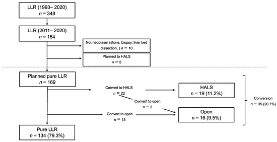 However, the conditions for selecting cases that can be continued with a hand-assisted procedure or require conversion to open surgery are still unclear. Furthermore, the outcome of conversion to HALS remains unclear, even though planned HALS is known to be superior to open surgery regarding bleeding control and postoperative recovery. To the best of our knowledge, few reports have focused on conversion to HALS, and no previous reports have described the predictors of conversion to HALS by using statistical analysis or attempting to predict difficult cases that will require pure LLR. This type of analysis may facilitate patient selection and identification of appropriate indications for LLR. To address this deficit, we aimed to determine the predictors of conversion to HALS or OLR using statistical analysis to assess the outcomes of conversion to HALS.
