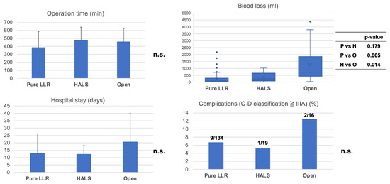 Outcome of pure LLR, conversion HALS or convert to OLR: Comparison of each outcome, pure LLR, conversion to HALS, or conversion to OLR. There was no significant difference in operation time, severe complication (more than Clavien-Dindo classification IIIa), or hospital stay. In terms of blood loss, patients who underwent a conversion to OLR had larger amounts of blood loss more frequently than those who had converted to HALS (p = 0.014) or pure LLR (p = 0.007). n.s., not significant.