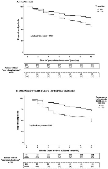The primary outcome was poor clinical outcome, defined as any (at least one) of the following events: (1) Need for hospitalisation due to an IBD flare; (2) Need for surgery due to IBD activity or complications of the IBD; and (3) IBD recurrence/flare-up that required a change in treatment (either intensification of the treatment or change to a different drug and addition of another therapy). The change in the treatment planned by the IBD team during the joint visits and performed immediately after transfer (in the first visit with the adult gastroenterologist) was not considered as a poor clinical outcome.
