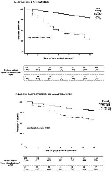Variables associated with poor clinical outcome. Variables associated with poor clinical outcome were analysed by Kaplan–Meier: (A) transition; (B) emergency visits due to an IBD flare before transfer; (C) nutritional support before transfer; (D) BMI < 18.5 at transfer; (E) IBD activity at transfer; (F) faecal calprotectin > 250 µg/g at transfer; (G) C-reactive protein > 0.5 mg/dL at transfer; (H) corticosteroids at transfer. Abbreviations: BMI: body mass index; IBD: inflammatory bowel disease.