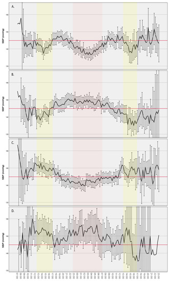 Generally, circadian rhythms are daily cycles of physiology and behavior with a period of approximately (circa) one day (diem) [13,14] and play important roles in the homeostasis of the human body [15]. It is known that blood pressure presents a circadian pattern that is characterized by higher diurnal values followed by a nocturnal decrease in both systolic and diastolic BP while sleeping (dipping) [16]. This typical circadian BP pattern, in addition to this profound sleep-related BP decline, also exhibits two daytime peaks, the first around or just after the commencement of daytime activity (morning surge) and a second, typically of smaller magnitude, a few hours later, and in between, there is a small afternoon nadir (approximately the duration of a siesta) [17]. These variations are determined not only by the sleep–activity cycle, but also by several endogenous circadian rhythms that affect vascular and cardiac functions [18].