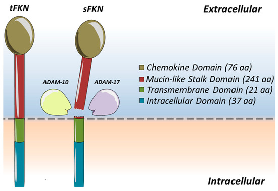 - Garton, K.J.; Gough, P.J.; Blobel, C.P.; Murphy, G.; Greaves, D.R.; Dempsey, P.J.; Raines, E.W. Tumor necrosis factor-alpha-converting enzyme (ADAM17) mediates the cleavage and shedding of fractalkine (CX3CL1). J. Biol. Chem. 2001, 276, 37993–38001. [Google Scholar] [CrossRef]