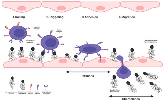 In order to understand the advantageous affinity of FKN, we first have to follow the classical method of leukocyte transmigration. It typically begins with leukocytes being captured and rolled on the endothelial surface with the help of E-, L-, and P-selectins [28]. The attachment of these immune cells to the endothelial surface then triggers the activation of integrins, which is used to secure the adhesion of leukocytes to the endothelium. This is further helped by interactions with endothelium-expressed ligand intracellular adhesion molecule (ICAM)-1 [29]. The trapped and captured leukocytes then exit the vascular wall and transmigrate into the affected tissue area [30]. In the presence of FKN, the high-affinity binding of FKN with CX3CR1 negates the need for integrin or selectin molecules as it no longer requires it for the adhesion of the leukocytes to the vascular wall [20,26]. As FKN has a high-affinity binding capability towards CX3CR1 receptors, it allows for faster binding, firmer adhesion, and bypass of the classical migration system to transmigrate leukocytes through its vascular wall [31]. It allows the cell to skip the rolling phase of leukocyte migration [32], hence replacing the need for VCAM-1 to integrin bindings, and is also thought to speed up the process of integrin-mediated transmigration of leukocytes-inflamed tissues [15,33,34].