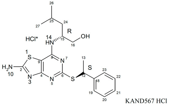 Compound structure of KAND567. * demonstrates that HCl is the salt component of KAND567 and is not a covalent part of the molecule. The HCl salt of KAND567 has a chemical name of (2R)-2-[(2-amino-5-{[(1S)-1-phenylethyl]sulfanyl}[1,3]thiazolo[4,5-d]pyrimidin-7-yl)amino]-4-methylpentan-1-ol hydro chloride.