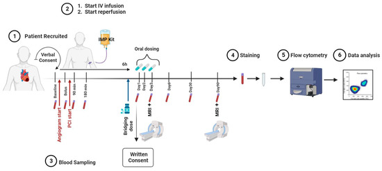 The FRACTAL (FRACTalkine inhibition in Acute myocardiaL infarction) study was designed as a phase IIa, randomised, two-arm parallel-group, placebo-controlled, double-blind, multi-centre trial. It evaluated safety, tolerability, and anti-inflammatory and cardio-protective effects after intravenous and oral administration of KAND567 in ST-elevation myocardial infarction (STEMI) patients undergoing percutaneous coronary intervention. For this, a cohort of 70 STEMI patients were admitted into two large tertiary centres in the United Kingdom (Figure 5). Included were patients within 5 h of chest pain onset with new anterior ST segment elevation, and an angiographic image confirming an occlusion in the proximal or mid-left anterior descending coronary artery (LAD) with Thrombolysis in Myocardial Infarction (TIMI) flow of 0–2. Only patients between the ages of 18 to 75 years old were accepted into the study. Exclusion criteria included cardiogenic shock, previous MI in the LAD territory, documented previous left ventricular systolic dysfunction (ejection fraction < 40%), previous coronary artery bypass graft (CABG), current use of steroids, immunosuppression, or benzodiazepines, active malignancy, renal failure, hepatic failure, and patients with any contraindication to cardiac MRI (CMR) scanning. Arterial blood sampling was obtained at the start of primary percutaneous coronary intervention (PPCI). Following angiography and final confirmation of eligibility, patients were randomised to receive the intravenous (IV) bolus of either investigational medicinal product (IMP) or placebo. To avoid delivery of the IMP after reperfusion of the occluded vessel, percutaneous coronary intervention (PCI) was only commenced following the intravenous bolus of IMP/placebo. Patients then completed the remainder of their IMP infusion over 6 h. Following the completion of their intravenous infusion, patients in both arms continued an oral IMP/placebo regimen over 72 h. The primary outcome of this ongoing pilot study will be safety, with a number of key secondary outcomes being assessed in parallel. Blood samples at nine different time points will be used to assess any changes in the immune compartment as well as in inflammatory markers. Further secondary endpoints of the study include the cardioprotective effects of KAND567, as measured by gadolinium-contrast CMR. Every patient will receive a baseline CMR scan on day 3 post MI, followed by a subsequent scan after 3 months. Image analysis will be performed by a Core lab which is blinded to the treatment assignment.