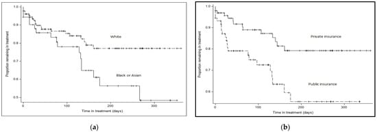 Plots of survival to termination of treatment separated by (a) race; (b) type of insurance.