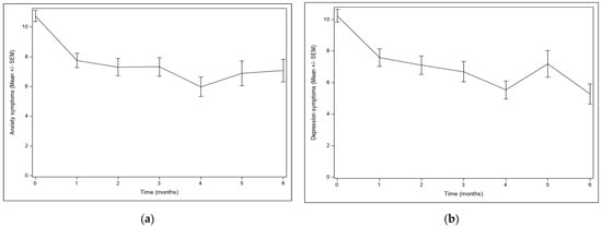 Trajectories of anxiety and depression symptoms were modeled for the 209 enrolled participants using latent growth modeling. We first tested whether there was selective attrition based on anxiety and depression symptoms. At each time point, starting with the second month, we found that anxiety and depression from the previous time point did not predict missingness. Next, for anxiety and depression symptoms separately, we fit models for the baseline and for each of the first six months of follow-up assessments, for which there were sufficient data to avoid convergence problems in estimation. For both anxiety and depression symptoms, cubic models had better fit than linear or quadratic models. As seen in Figure 3, the mean levels of symptoms for both anxiety (Figure 3a) and depression symptoms (Figure 3b) decreased over time. The most dramatic decreases were in the first month, when most of the treatment occurred. The modeling showed significant decreases in anxiety from baseline to month 1 (delta = 2.36, Wald test = 46.96, p < 0.0001), as well as from month 1 to month 6 (delta= 1.96, Wald test = 7.94, p = 0.0048) and in depression from baseline to month 1 (delta = 2.30, Wald test = 53.42, p < 0.0001) and from month 1 to month 6 (delta = 1.94, Wald test = 14.46, p = 0.0001).