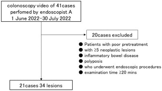 The study used all 41 colonoscopies performed by expert Endoscopist A (Y.M.), who is a Board Certified Fellow and Trainer of the Japan Gastroenterological Endoscopy Society at Tokyo Women’s Medical University from 1 June to 30 July 2022, using a high-definition colonoscope (EC-760ZP-V/M, FUJIFILM Medical, Tokyo, Japan) and a high-definition monitor (CuratOR EX2621, EIZO Corporation, Hakusan, Japan). To avoid selection bias, we did not examine the symptoms, purpose of being examined, age, or sex of any of the patients. Referring to the previous report [16], the inclusion criteria were the presence of at least one neoplastic lesion (adenoma or adenocarcinoma) measuring < 10 mm. For the final determination of whether the lesion was neoplastic, the gold standard was CAD EYE’s CADx diagnosis. Patients with poor pretreatment (0 or 1 in any segment on the Boston Bowel Preparation Scale), with ≥5 neoplastic lesions, with inflammatory bowel disease, with polyposis, who underwent endoscopic procedures that included biopsies, and whose examination took ≥20 min were excluded. Finally, 21 patients with 34 lesions were included (Figure 2).