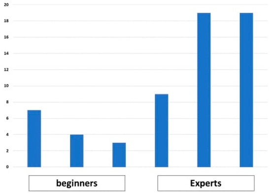 The number of false positive B in the beginner group was 1.667 ± 0.577, 9.667 ± 6.807 in the expert group, and 25 in the CAD group. The results of one-sample and unpaired t-tests showed a significant difference only between the beginner and CAD groups (p = 0.001), with the latter having significantly more false positive B. There were no significant differences between the beginner and expert groups (p = 0.534) or between the expert and CAD groups (p = 0.180) (Figure 13).