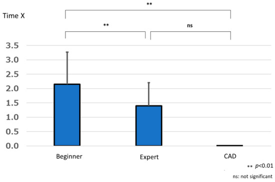 The difference in the time to lesion detection by beginners was 2.147 ± 1.118 s, that by experts was 1.394 ± 0.805 s, and that by CAD was 0.000 ± 0.000 s. One-way repeated measures analysis of variance showed a significant difference in the lesion detection times between the beginner, expert, and CAD groups (F (1.612, 166) = 18.787, p < 0.001). Multiple comparisons using the Bonferroni method showed significant differences between beginners and experts (p < 0.001) and beginners and CAD (p < 0.001), with experts and CAD having significantly shorter times for lesion detection compared to beginners. No significant difference was found between experts and CAD (p = 1.000) (Figure 10).