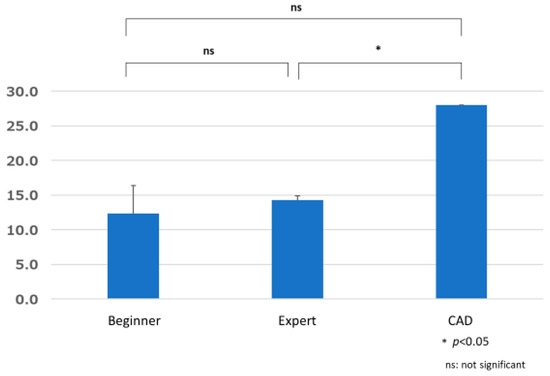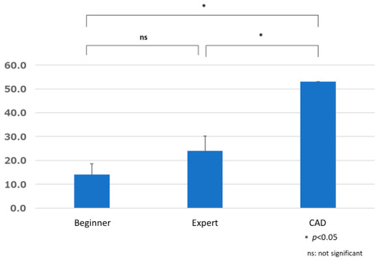 The total number of false positives 14.000 ± 4.583 for the beginner group, 24.000 ± 6.245 for the expert group, and 53 for CAD. The results of one-sample and unpaired t-tests showed significant differences between the beginner group and CAD (p = 0.014) and between the expert group and CAD (p = 0.045), with significantly more false positives for CAD than for the beginner and expert groups. There was no significant difference between the beginner and expert groups (p = 0.267) (Figure 11).