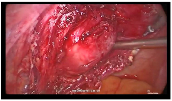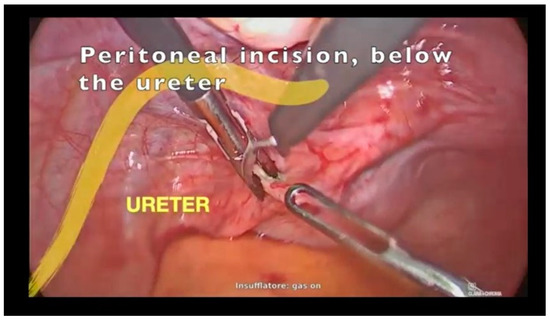 The patient was scheduled for minimally invasive surgery. After the induction of the pneumoperitoneum and entrance in the abdomen, the bulging neoformation was transperitoneally identified below the ureter (Figure 1) and behind the caudal limit of the left uterosacral ligament.