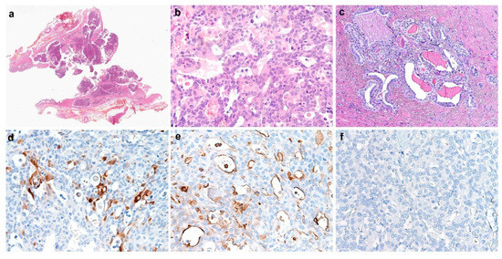 (a) Intracystic mesonephric carcinoma of the vagina, with no evidence of extracapsular invasion (H&E, whole tumor section); (b) mesonephric carcinoma of the vagina with tubular pattern, showing densely eosinophilic intraluminal secretions (H&E, 20×) and (c) mesonephric remnants detected in vaginal wall (H&E, 10×). (d–f) Immunohistochemical profile of mesonephric carcinoma, namely tumoral cells, were positive for calretinin ((d), 20×)) and CD10 ((e), 20×)), while negative for progesterone receptor ((f), 20×)).