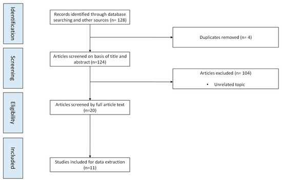 The search strategy retrieved 128 items. After duplicates’ removal (n = 4) and screening of all the manuscript titles and available abstracts (n = 103), 20 studies were assessed for full text evaluation. Finally, 11 of those were elegized for data extraction. The flowchart of study selection is shown in Figure 5.