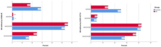 The association between the body composition phenotypes and HS was next evaluated. A significant difference in the distribution of the four adiposity phenotypes between HS and controls was observed when MetH was defined by either HOMA-IR (χ2 = 7.1, p = 0.005) or NCEP-ATP III (χ2 = 7.31, p = 0.007) criteria (Figure 1). Notably, a significantly higher proportion of individuals with HS were classified as MUHOWOB by both definitions but a lower proportion were classified as MHNW.