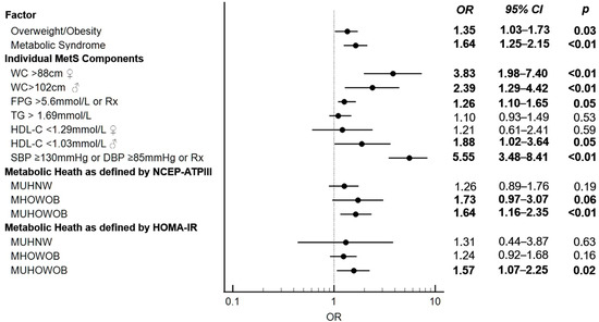Forest plot summarizing HS risk for individual components of the metabolic syndrome and body composition phenotypes using two definitions of metabolic health. WC: Waist circumference, FPG: Fasting plasma glucose, TG: triglycerides, HDL: high-density lipoprotein, SBP: Systolic blood pressure, HOMA-IR: Homeostatic Model Assessment for Insulin Resistance, OR: Odds ratio.