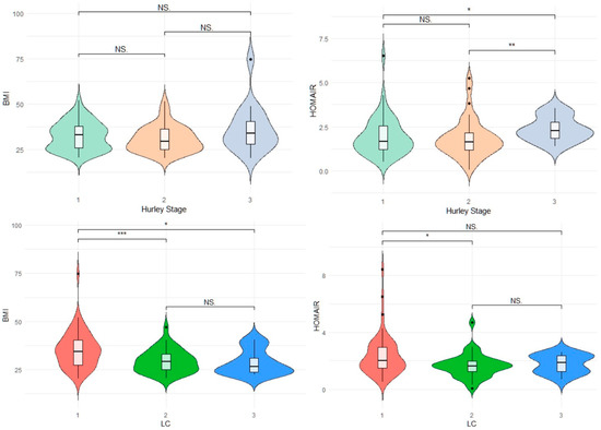 Violin plots illustrating relationship between HS Hurley Severity/LC phenotype and BMI/HOMA-IR parameters * p ≤ 0.05 ** p ≤ 0.01 ** p ≤ 0.001 BMI: Body mass index in kg/m. NS: Non significant, LC: Latent Class Phenotype.