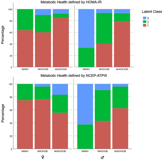 Gender-stratified analysis of body composition phenotypes in Latent class phenotype/metabolic health (as defined by HOMA-IR and NCEP-ATPIII).