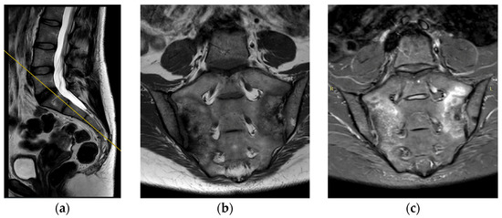 Currently, magnetic resonance imaging (MRI) of sacroiliac joints is considered a first-line method of choice for early axSpA diagnostics [7], although other imaging modalities can also be used to diagnose abnormal conditions in the joints [8] This examination is performed only for specific indications, including bone, joint or soft tissue infection, inflammation of SIJ, SIJ dysfunction, ankylosing spondylitis, degenerative arthritis, SIJ pain or stiffness, avascular necrosis, rheumatoid arthritis, osteoarthritis, sacroiliitis, psoriasis and gout [9]. MRI is, therefore, a diagnostic procedure that enables the assessment of active inflammation within SIJs (sacroiliitis) [10,11].