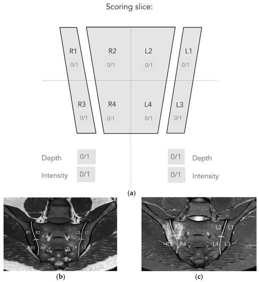 Scoring scale used in the study. The evaluation involves six slices of each examination. (a) Graphic illustrating the division of the SIJ into quadrants: R1—right iliac (upper), R2—right sacral (upper), R3—right iliac (lower), R4—right sacral (lower), L1—left iliac (upper), L2—left sacral (upper), L3—left iliac (lower), L4—left sacral (lower). Depth and intensity rating details (SPARCC scale) are provided below the graphic. (b) Quadrant division illustrated on the T1 sequence. (c) Corresponding quadrant division illustrated on the STIR sequence.