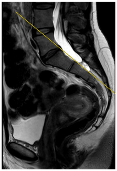 The measured deviation angle equals 0 degrees, properly performed MRI examination of the sacroiliac joints, T2-weighted sequence. The yellow line marks the actual plane in which the slices were acquired, while it is also the fully correct line drawn between the posterior edges of the S1 and S2 vertebrae.