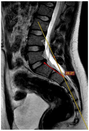 The measured deviation angle equals 29.2 degrees (group 4), T2-weighted sequence. The red line is the fully correct line drawn between the posterior edges of the S1 and S2 vertebrae. The yellow line marks the actual plane in which the slices were acquired.