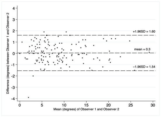 Difference between measurements of deviation angle (degrees) in 173 studies taken by Observer 1 and Observer 2 plotted against their mean.