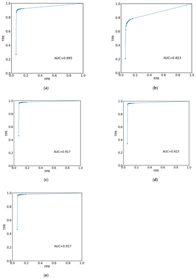 ROC curves calculated for all the samples (a) and separately for the samples assigned to the four groups: (b) Group 1; (c) Group 2; (d) Group 3; (e) Group 4.
