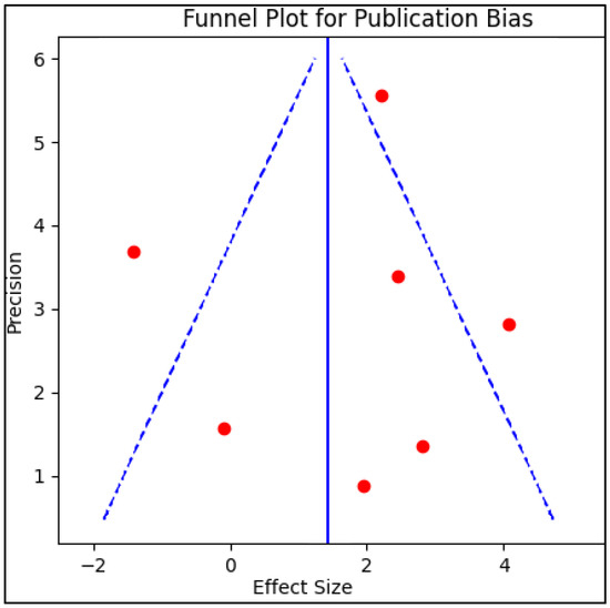 The systematic review incorporated seven studies, enlisting a total of 412 patients who underwent telemedicine-driven pulmonary rehabilitation after the acute phase of COVID-19 [21,22,23,24,25,26,27], with good reliability for publication bias, as presented in Figure 2. The cohort sizes varied substantially across the studies, with the smallest involving 7 patients [27] and the largest encompassing 119 participants [25]. The average age of the participants differed across the studies, ranging from the lowest mean age of 42 years reported by Tanguay et al. [27] to the highest mean of 62 years reported in the control group of Martin et al.’s study [22]. The age differences within each study were also variable, suggesting potentially different age-related effects on the outcome of rehabilitation.