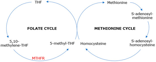 Methylenetetrahydrofolate reductase (MTHFR) is an enzyme in the folate cycle that reduces 5,10-methylenetetrahydrofolate—the major form of cellular folate—to 5-methyltetrahydrofolate, which is the main form of circulating folate [1] and the substrate for methionine synthase, serving as a methyl donor in the methionine cycle. This leads to the methyl-cobalamin (methyl-vitamin B12)-dependent conversion of homocysteine, a sulfur amino acid, to methionine, an essential amino acid. Subsequently, methionine provides the methyl group for further reactions, being transformed into S-adenosylmethionine, which plays an important role in the trans-sulphuration pathway and various trans-methylation reactions [2] (Figure 1). Therefore, MTHFR catalyzes vital cell metabolism processes, including DNA and RNA synthesis and repair and protein methylation, providing a normal range of methionine and homocysteine [3,4].