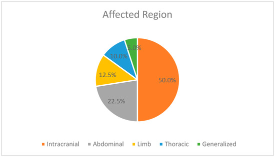 In our study, thrombosis affected multiple anatomical regions of the body, as illustrated in Figure 2. Among the cases analyzed, 20 patients presented with intracranial thrombosis, involving conditions such as intraventricular or intraparenchymal hemorrhages, cerebellar hemorrhages, post-hemorrhagic hydrocephalus, cerebral venous sinuses thrombosis, and ischemic strokes. Additionally, ten patients exhibited thrombosis of the abdominal vessels, including the inferior vena cava, portal vein, renal veins, common iliac veins, external iliac veins, mesenteric veins, abdominal aorta, common iliac arteries, and mesenteric arteries.