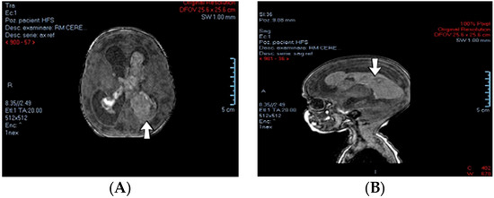 A 2-week-old female neonate (39 weeks, 3.16 kg) presented with opisthotonos and generalized tonic–clonic seizures, known with hydrocephalus of the lateral and third ventricles, from a consultation performed a couple of hours before admission. The brain ultrasound from admission indicated left intraventricular hemorrhage and intraparenchymal hemorrhage of the left parietal and occipital lobes, affecting the left thalamic and subthalamic regions, with extension to the right thalamus (Figure 3).