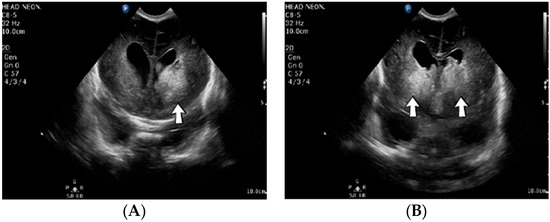 A 2-week-old male neonate (36 weeks, 2.99 kg), delivered by emergency cesarean section due to abnormal cardiotocography and severe oligohydramnios, with true umbilical cord knot at birth, presented with left intraventricular and intraparenchymal hemorrhage revealed from the brain ultrasound performed at 8 h of life. Myoclonic seizures appeared three days after admission, progressing to generalized tonic–clonic seizures. An ultrasound of the brain was performed, which indicated new bleeding of the bilateral basal ganglia (Figure 4).
