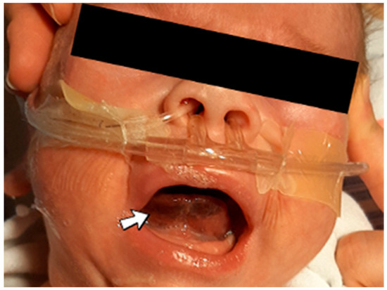 A 1-day-old male neonate (42 weeks, 2.15 kg) presented with VACTERL disorder (vertebral defects and numerical rib anomalies, esophageal atresia with distal tracheoesophageal fistula, and horseshoe kidney). Surgical correction of the esophageal atresia was performed at six days of life. At 18 days of life, the patient developed seizures and opisthotonos. An ultrasound of the brain indicated right intraventricular hemorrhage and intraparenchymal hemorrhage of the right basal ganglia and thalamus. An elevated, but decreasing c-reactive protein was identified. Later, during hospitalization, a sublingual hematoma was noticed (Figure 5).