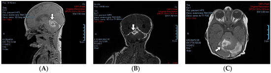 Case no. 15. Posterior cranial fossa hemorrhage on brain MRI—sagittal (A), frontal (B), and transverse (C) views.