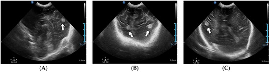 Cerebral thromboembolism on brain ultrasound: parietal lobes (A–C).