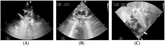 A 19-day-old male neonate (35–36 weeks, 2.20 kg) presented with thrombosis of the right pulmonary artery diagnosed on the same day at another pediatric emergency department, where treatment with continuous heparin infusion was initiated. The admission laboratory findings showed elevated c-reactive protein, modified coagulation tests (ongoing anticoagulation treatment), and elevated D-dimer tests. The cardiac ultrasound identified thrombi in the right atrium and ventricle (Figure 15). Therapy with heparin was continued, to which alteplase was added. After four days of anticoagulation and fibrinolytic therapy, the thrombi could no longer be noticed on ultrasound or CT scan.