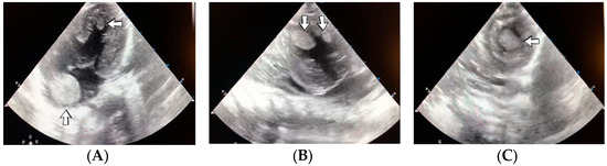 Intracardiac thrombosis identified on cardiac ultrasound: left atrium and ventricle (A), left ventricle (B), apex (C).