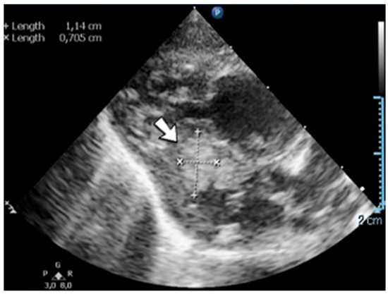 A 7-week-old male infant (36 weeks, 2.50 kg), the first twin from a twin pregnancy, presented with a complex congenital cardiac malformation for an elective surgical procedure (Blalock–Taussig shunt). Heparin infusion for the shunt was started immediately after the intervention and anticoagulation was continued with enoxaparin due to good clinical condition. Then, 18 days after the procedure, a routine cardiovascular ultrasound revealed a thrombus in the left ventricle (Figure 16). The laboratory studies showed leukocytosis, highly elevated c-reactive protein, and modified coagulation tests (due to anticoagulant treatment). Continuous heparin infusion was reinitiated, but multiple intracardiac thrombi were detected during the following days. Treatment with alteplase was also started, but the patient’s condition continued deteriorating, leading to a negative outcome due to cardiac failure.