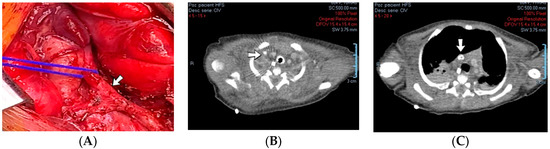 Case no. 39. During surgery, a fibrous band (A) was noticed between the right internal jugular and brachiocephalic veins. Thrombosis of the right internal jugular vein (B) and the superior vena cava (C) was identified on Angio-CT.