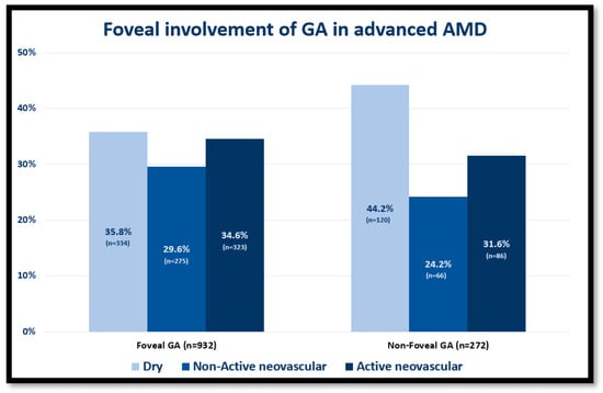 The results of this study also demonstrated that foveal involvement of GA in advanced AMD is more likely in nAMD than in dry AMD. Although GA and MNV are considered different manifestations of advanced AMD, they can coexist in the same eye [,,].
