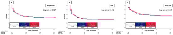 Kaplan-Meier curves for low and high CVR within the entire study cohort (A), patients with AMI (B) and non-AMI patients (C).