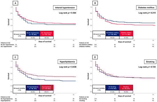 Kaplan-Meier curves for arterial hypertension (A) diabetes mellitus (B), hyperlipidaemia (C) and smoking (D).
