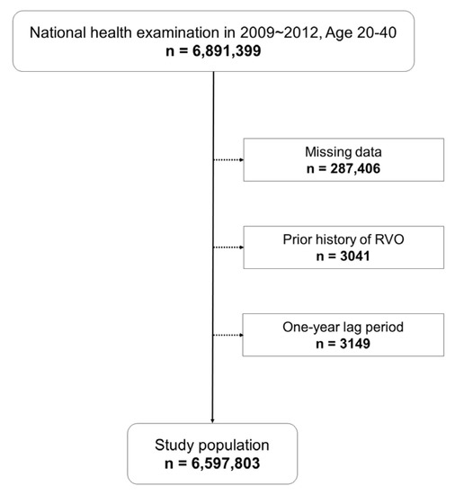 Among all NHI beneficiaries, subjects aged over 20 to under 40 years who underwent the National Health Examination between January 2009 and December 2012 were included at baseline. Individuals with missing data and a prior history of RVO were excluded. A one-year lag period was incorporated from the date of the healthcare checkup to account for the duration of mental disorders.