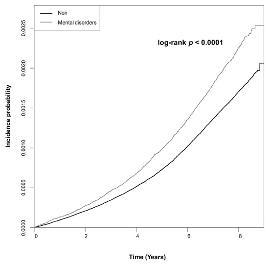 In total, 10,145 subjects were diagnosed with RVO, among whom 1304 had a prior diagnosis of mental disorders, while 8841 had not been diagnosed with mental disorders. Figure 2 shows the Kaplan–Meier curve for the cumulative incidence of RVO and demonstrated a substantially higher incidence probability in subjects with mental disorders (log-rank p < 0.0001). In the subgroup analysis, all subjects except those with schizophrenia showed a higher incidence probability relative to those in the non-diagnosed group (Figure 3).