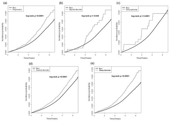 Kaplan–Meier curve for cumulative incidence of retinal vein occlusion (RVO) in the subgroup analysis. (a) Depression, (b) bipolar disorder, (c) schizophrenia, (d) anxiety disorder, (e) sleep disorder.