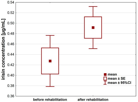 A 21-day individual rehabilitation exercise training program significantly changed irisin levels in patients after hip or knee replacement (Table 2). Irisin levels increased after the rehabilitation (p < 0.05) by about 0.06 ± 0.16 µg/mL (95%CI: 0.01–0.12) (Figure 1).