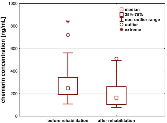 Chemerin levels also significantly differed before and after a 21-day individual rehabilitation exercise training program (p < 0.001). The rehabilitation decreased chemerin concentration by about 60.9 (33.1–128.5) ng/mL (Figure 2, Table 2).